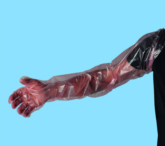 Dünner Handschuh für Hygienezwecke. Schutz bis an die Schulter. Transparent, rötlich eingefärbt.